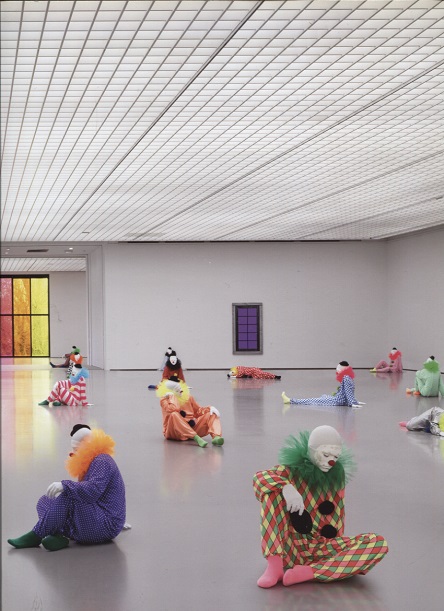With his installations, Ugo Rondinone creates personal dreamscapes. In his retrospective exhibition at the Museum Boijmans Van Beuningen in Rotterdam, the artist presented Vocabulary of Solitude, an arrangement of his works inspired by the color spectrum. Clowns, clocks, candles, shoes, windows, light bulbs and rainbows: they are recognizable images that speak to all of us. These symbols excite free-association and memories. The forty-five clowns with their different postures represent activities of everyday life, at the same time expressing the anguish of human solitude: be, breathe, sleep, dream, wake, rise, sit, hear, look, think, stand, walk, pee, shower, dress, drink, fart, shit, read, laugh, cook, smell, taste, eat, clean, write, daydream, remember, cry, nap, touch, feel, moan, enjoy, float, love, hope, wish, sing, dance, fall, curse, yawn, undress, lie. This is the first of a four-chapter publication series by Ugo Rondinone.