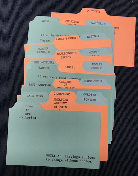 Author: Paul Steiner Publisher: The Letter edged in Black Press Inc. Year: 1968 SMS-Portfolio 6 printed archive cards, 8,5 x 12,5 cm, Edition of 2000 A set of 24 coloured file cards, arranged alphabetically, each containing a brief review of public restrooms in New York City's art galleries and museums. Sample cards: "Morgan Library: absolutely breathtaking and splendiferous, especially the ladies." "American Academy of Arts and Letters: Ladies behind small drawing room with Childe Hassam oils. Gents' too complicated, better forget it." Condition: very good